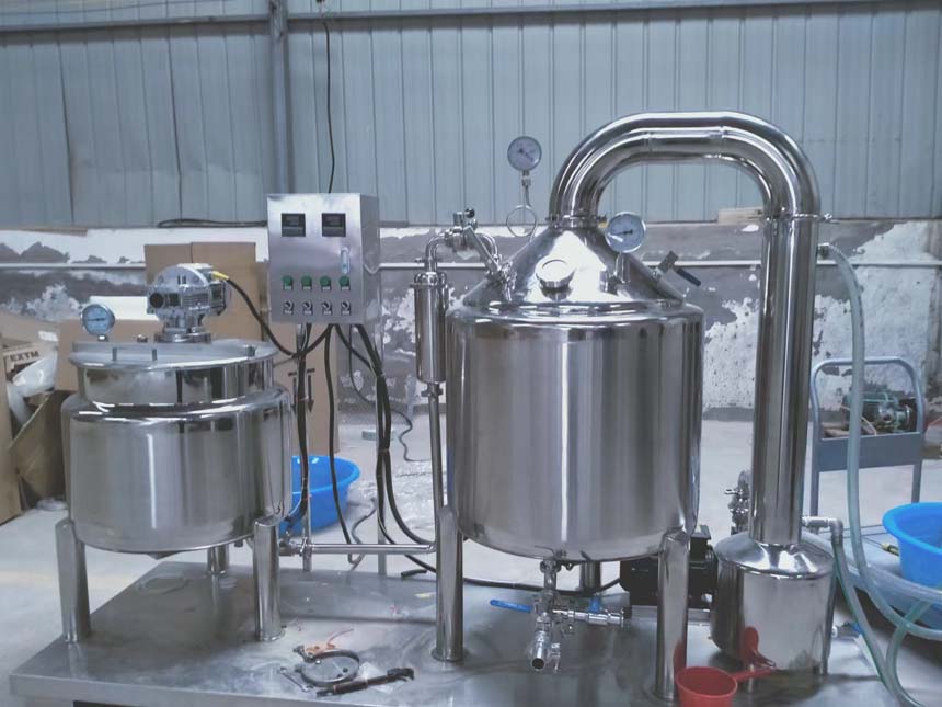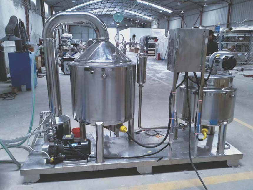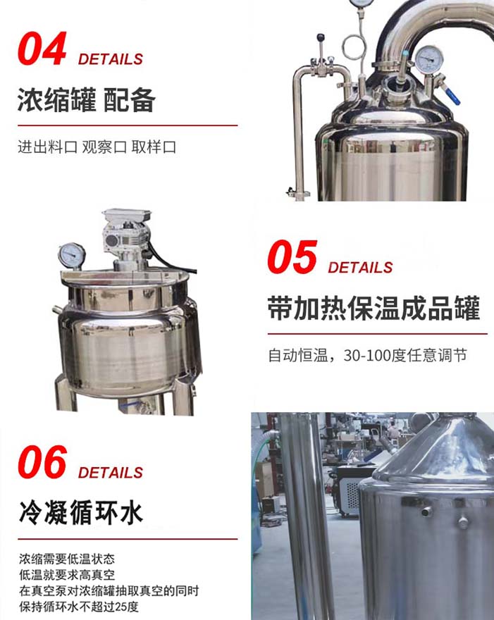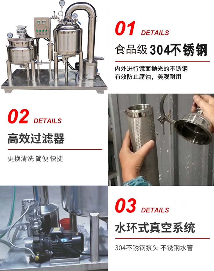 1 .設備由預熱罐、過濾器、濃縮罐、冷凝器、回收罐、真空泵部件組成,結構緊湊,占地面積小。